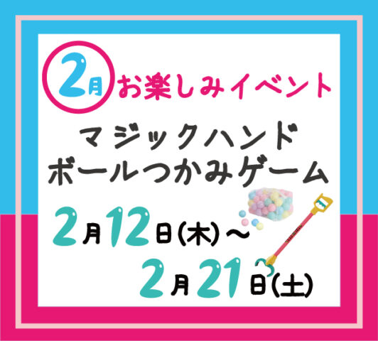 ★2月のお楽しみイベント★『ボールプールの中からピンポン玉をマジックハンドでつかみ取ろう!』ドキドキ💓わくわく✨チャレンジゲーム!!● ● ● ● ● ● ● ● ● ◆◆イベント開催期間◆◆2月12日(木)~2月...